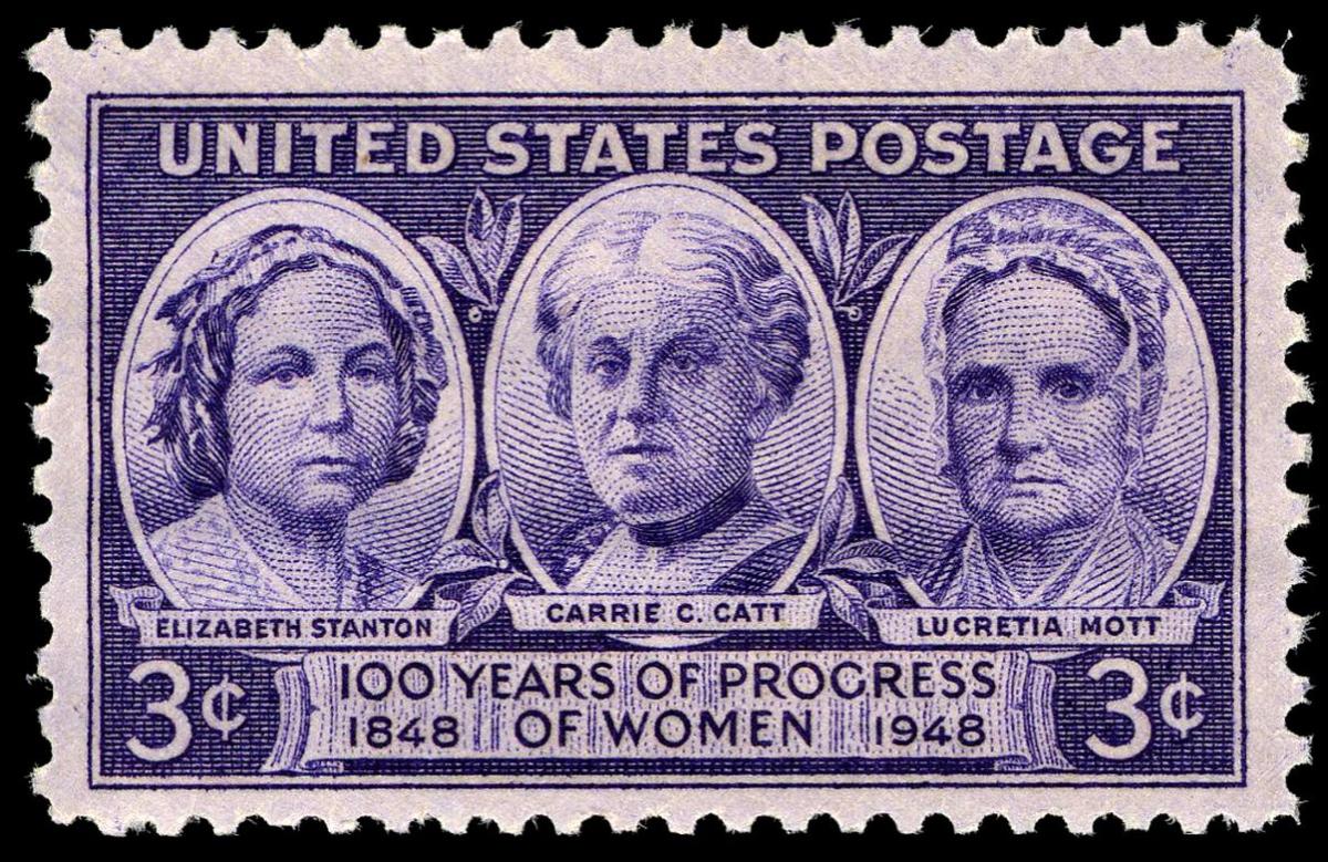 U.S. commemorative stamp of 1948, Seneca Falls Convention titled 100 Years of Progress of Women: 1848–1948. Wikipedia, https://upload.wikimedia.org/wikipedia/commons/e/e8/Progress_of_Women_issue_of_1948%2C_3c.jpg.