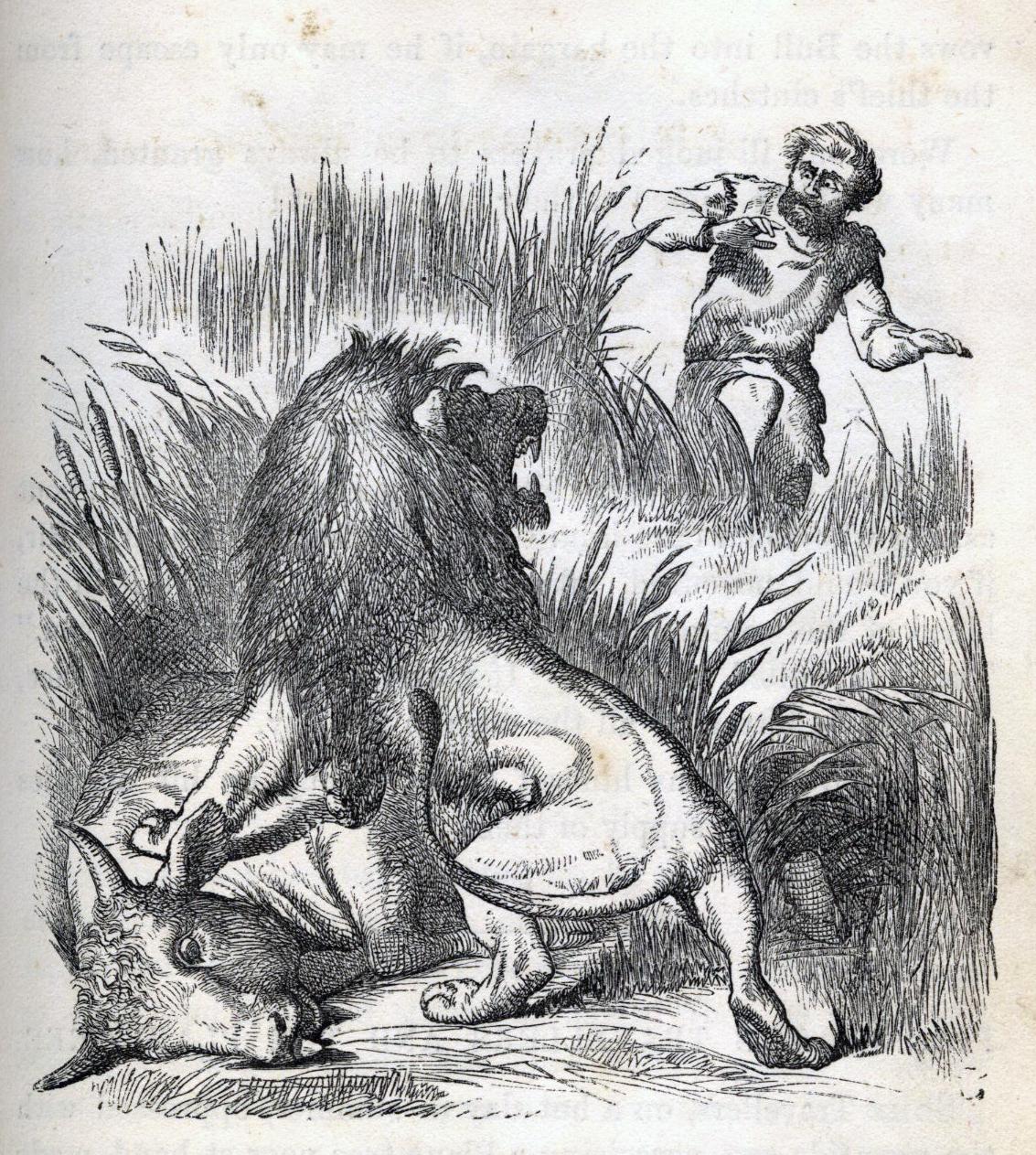John Tenniel, "The Herdsman and the Lost Bull," from Aesop's Fables, adapted by Rev. Thomas James, 1848. John Tenniel immortalized the British Lion in his illustrations and elevated the symbol in the Victorian Era, but he also excelled in drawing the magnificent animal. In “The Herdsman and the Lost Bull,” a herdsman has lost a calf and prays to G-d to find the lost animal. He discovers the calf being eaten by a lion and vows he would also sacrifice a full-grown bull if he could escape the encounter alive. Tenniel illustrates the British Lion as an intimidating figure; as Catherine Golden notes in "John Tenniel's Animals," “the lion exudes invincibility from its razor-sharp teeth to its claws ” (25-26). Tenniel features the animal's powerful stance, silhouetted face, and rows of sharp teeth as well as the herdsman's fear.