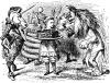 John Tenniel, "The Lion and the Unicorn," from Alice Through the Looking-Glass, by Lewis Carroll, 1872: The Lion appears on the Royal Coat of Arms of Britain and Scotland alongside a Unicorn, symbolizing the two countries respectively. Tenniel revisits the symbol in his illustrations for Through the Looking-Glass by Lewis Carroll. The third image in this case depicts a Lion and a Unicorn fighting for the right to wear the White Crown. In addition, the Lion here resembles Benjamin Disraeli while the Unicorn looks like William Gladstone, both Parliamentary figures from the Victorian age. Tenniel reflects the contemporary conflict in Parliament between Prime Ministers Disraeli and Gladstone as they vied for positions of power (Gray). Carroll and Tenniel utilize the recognizable symbolism of the lion to satirize and mock contemporary political figures and events.