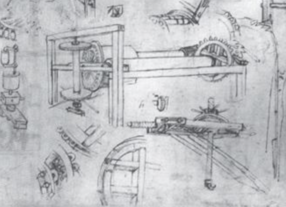 Brunelleschi was the main designer, engineer, and architect of the Florence Duomo. He was the master of his time, so it is no surprise that Leonardo looked up to him heavily. This sketch comes from Leonardo's notebook and dissects the main components of Brunelleschi's reversible hoist. This is thought to be the main machine that hoisted material to the top of the duomo, making it safe to infer that Leonardo worked closely with Verrocchio and therefore Brunelleschi on the construction of the duomo and its lantern.