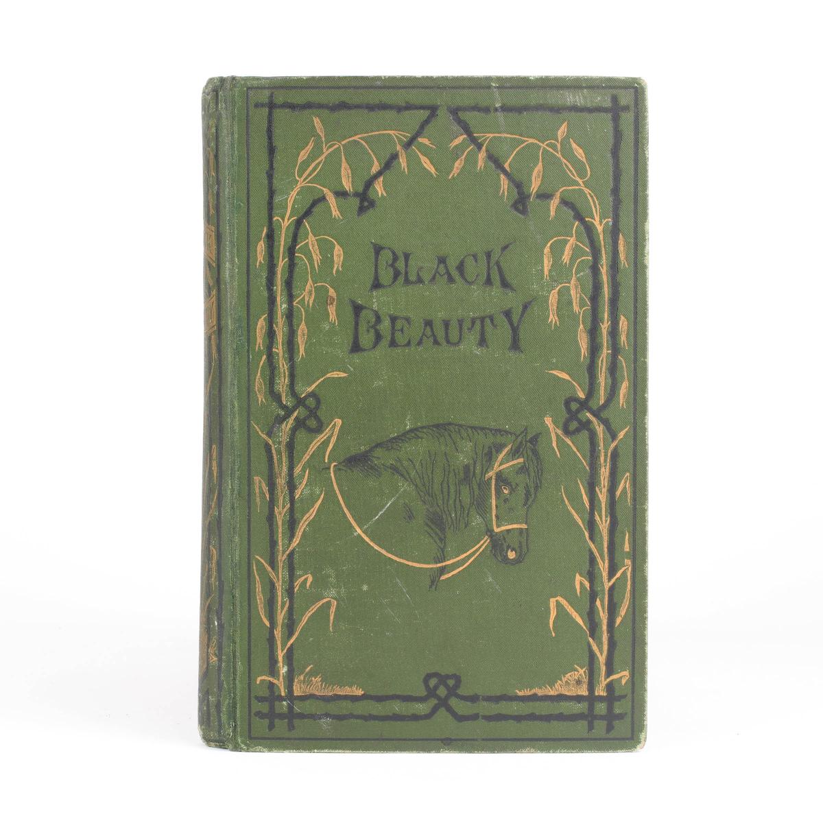 Cover of the novel Black Beauty, first edition 1877, published by London: Jarrold and Sons. This original cover is beautifully framed with golden wheat, which alludes to Beauty's first and last homes. This particular book, selling for the price of £35,000.00, is inscribed by Sewell to her cousins, making it especially valuable as Sewell only lived for a few months after her book’s publication. The cover displays Black Beauty in the center, asserting him as the subject of the book. The subtitle of Black Beauty, “His Grooms and Companions, the Autobiography of a Horse,” informs us that the book is written in a memoir style that chronicles the horse’s life experiences, and the former part emphasizes the importance of the impact his masters had on his life. The personification of the animals in the story that are affected by human cruelty creates an emotional connection that develops empathy for animals, helping readers to understand why the mistreatment of animals is wrong. This piece of children’s literature is also the first autobiography from the vantage point of an animal. It acts as a didactic text with Christian influence, reflecting the nature of children’s literature in this time it was written in.