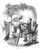 This is an 8 cm by 6.5 cm wood-block engraving black and white vignette illustration by John Leech and it appears at the end of Stave Five in A Christmas Carol. It shows Scrooge and Bob Cratchit sitting in Scrooge’s office which appears to be decorated for Christmas and together they share smoking bishop. It is a type of mulled wine or punch and was popular in Victorian times around Christmas time. Both men, especially Scrooge, look happy about their encounter given the distance between the two men and how the share the table together so closely. Bob has been told that he will be getting a raise with his salary and Scrooge is happy with his change of heart after the visions the three ghosts have shown him. The furniture in the room and the character’s attire reflect the period which the story is set in as well as the candlelight that is used to light the room. John Leech was also known for doing caricatures which explains why Scrooge’s face appears more detailed and exaggerated compared to the drawings of him throughout the novella. It is an interesting contrast that Leech made this the final illustration of the novella considering his first drawing in the novella (excluding the front piece) is in color and includes Scrooge and Marley’s ghost. Both characters in that image lack the detail in facial expressions but it is noticeable that Scrooge is scared the ghost of a dead friend and pulls his body into the chair in fear. In this final illustration, the two characters look relaxed and happy which also reflects the happy ending of the story where Scrooge learns the true meaning of Christmas and spends the day with Bob’s family.