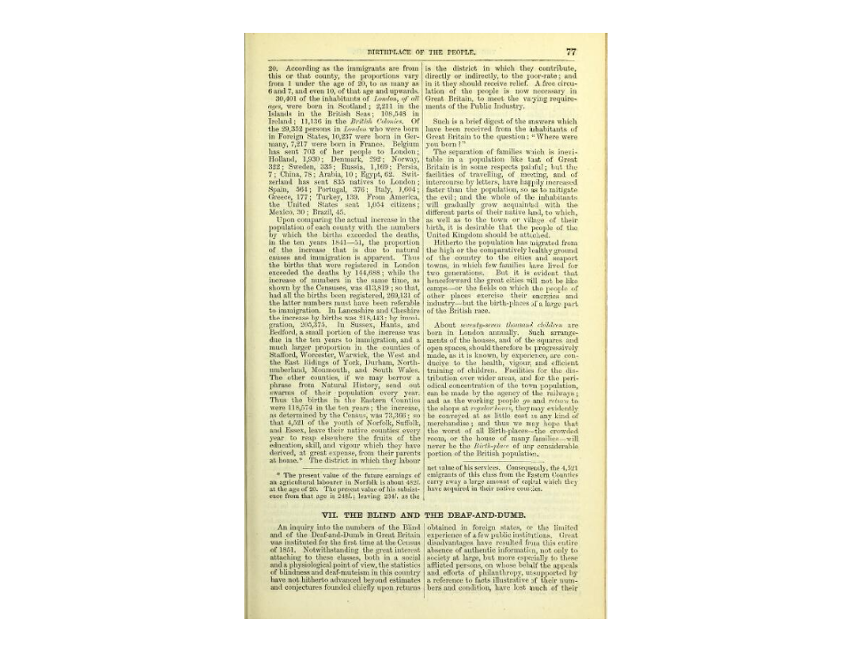 General Register Office, Great Britain (1854).The census of Great Britain in 1851 : comprising an account of the numbers and distribution of the people, their ages, conjugal condition, occupations, and birthplace, with returns of the blind, the deaf-and-dumb, and the inmates of public institutions, and an analytical index : reprinted, in a condensed form, from the official reports and tables. Wellcome Collection.