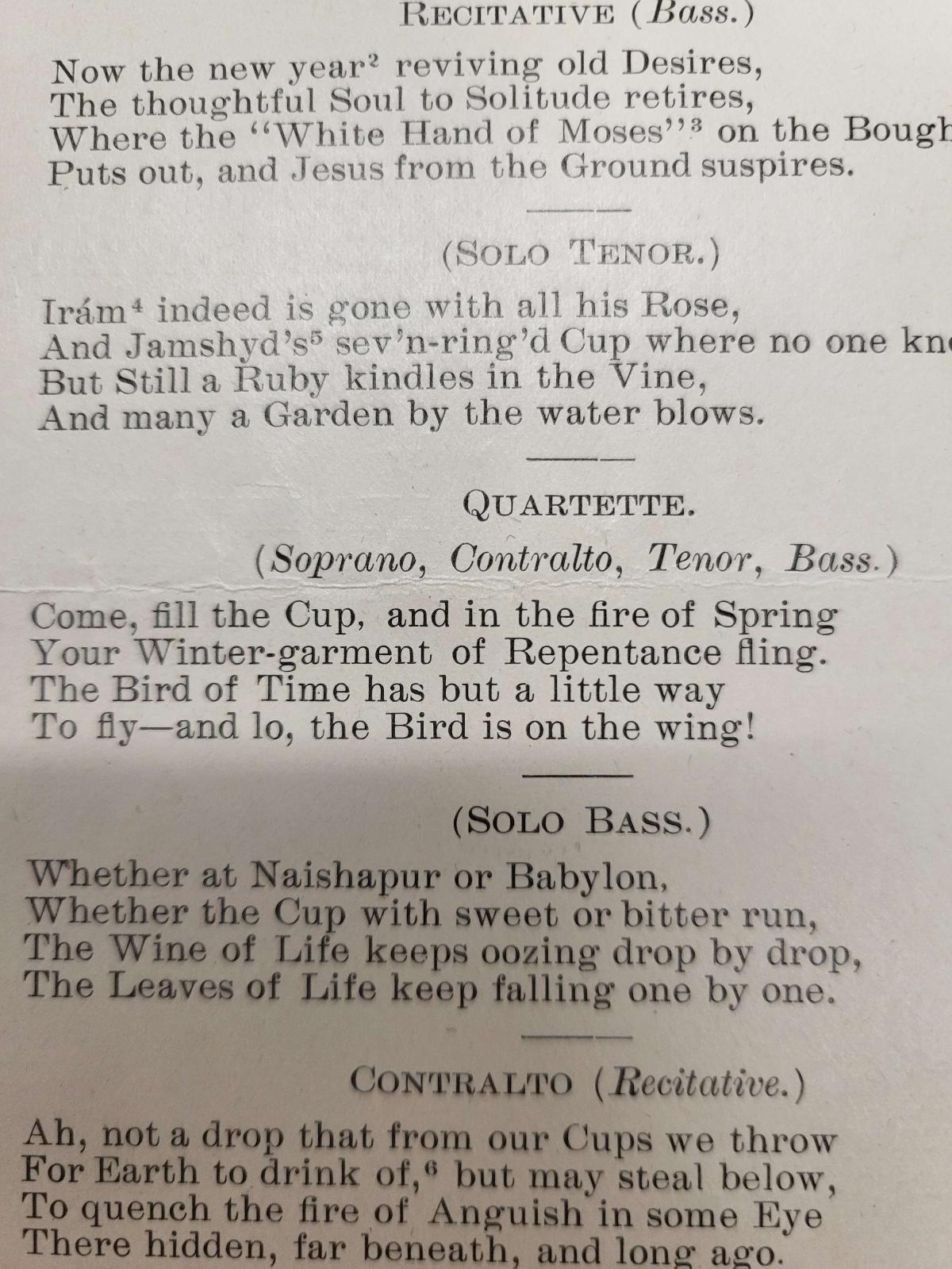 Starting with the words themselves, many of the symbols in this stanza are highlighted by the way Fitzgerald utilizes capitalization: ‘Cup’, ‘Spring’, ‘Winter-garment of Repentance’ ‘Bird of Time’, and again, ‘Bird’. The ‘Cup’ here holds a double meaning. More literally, this is about a cup of wine, which Khayyám repeats throughout his work to represent drinking and drunkenness. It also here stands for life itself, implying it as a vessel to be filled with experiences or desires (and aforementioned drinking.) Of course, Lehmann can’t literally capitalize letters in an audio form, and so her interpretation repeats the phrase “Come fill the Cup” and indicates for vocalists to use louder volume. The mention of Spring introduces the idea of a “Winter-garment of Repentance,” in other words, Repentance that may have been required in the past (a garment for winter) that can now be discarded for a change in needs. This change of seasons also indicates the passage of time, which is then given the metaphorical ‘Bird’ which is implied to have limits that it is already moving towards. The tempo and round-style with staggered voices bring to mind stops and starts, paired with a rushing, then slowing speed, which brings to mind the temporality of Fitzgerald’s translation. There’s also a certain sensuality to the mention of removing a garment, especially one that may symbolize past regrets or punishments. Lehmann chooses to overlook this in her compositions, deciding not to emphasize the fiery aspect of the verse. Her accompaniment for the line remains fast and light.
