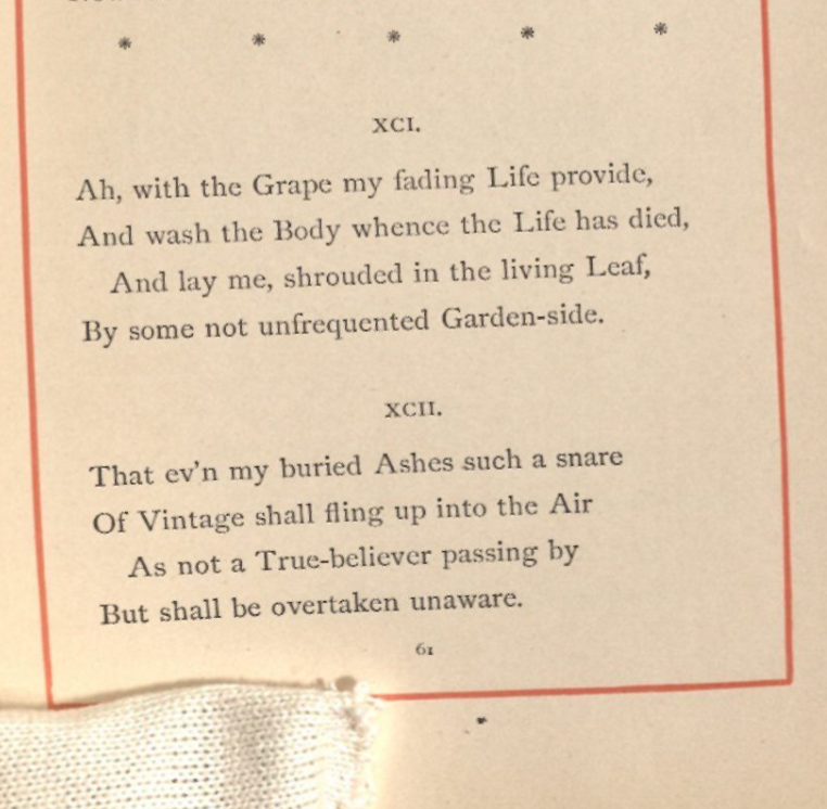 Since the Rubáiyát’s speaker spent many previous stanzas discussing a life spent in pleasure, notably with wine, his last wish to be turned into wine seems fitting, his life returning back to what has nourished it so far. While the Rubáiyát expresses religious skepticism of a life after death, it does offer the reader an idea of peace for death, that one’s body will offer a new life through nourishing plants in a garden “not unfrequented” by others who will get to experience its beauty. The stanza retains a light, even joyous tone as its one line mentioning death explicitly is immediately followed by explicit life of “the living leaf.” The speaker proposes a peaceful, serene idea of death to the readers, the “fading” body beginning to return to nature before its final death as the speaker’s blood turns to wine itself: the “Grape” of his body washing away the death, or decomposition, of the speaker’s corpse. This idea of natural burial is composed as a final wish, instructing the reader to “lay” the speaker wrapped in live nature in a beautiful place, thereby making his own death beautiful by association.