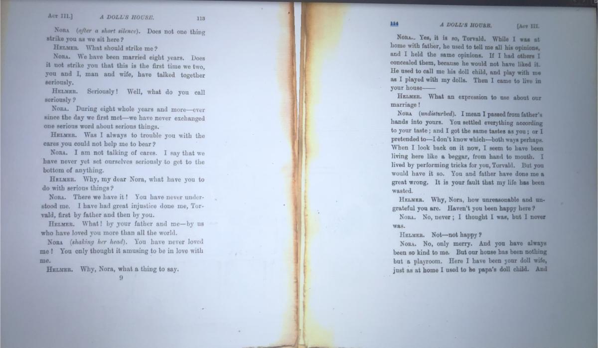 I keep rifling through the parcel to find a page from my favorite play in the entire world: A Doll’s House by Henrik Ibsen. A perfect edition for my scrapbook and seeing the worn pages warms my heart. My mother and I had gone to see it when it was first performed in London in 1889, I can still see the sea of red seats along with the matching curtains. I always rang true with, “You and father have done me a great wrong. It is your fault that my life has been wasted.” (114) It used to terrify me so much so that my life would potentially be wasted away as poor Nora had. Not only so, but to be abused by her husband by financially crippling her and demeaning her after the mistreatment of her father who did the same, I remember reading it the first time and looking at my mother as I asked if the same was to become of me. Of course, she had smiled kindly as we were waiting for the play to start and there was still the rustling of the audience’s voices as she said, “No, of course not my dear.” Even though upon years after years later, I reflected that my mother was Nora and my father Torvald, but I was the helpless watcher on the outside of the pages. Or am I really outside the pages? Afterall, weren’t Nora’s children doomed to the same fate as her, at least her girls? I would hope to laugh in the face of that and use it as the fire in my breast to never see it come into fruition. I will always use this as my inspiration and a remembrance of where I could have been. I’ve made sure to study astrology at my university (one of the only five women I would like to add), work at the library, read every book I can find, and absorb any knowledge I can. I will not waste my life and I think Nora would be proud.
