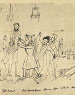 "An earlier, non-retouched print of the Berliner Freien (Free ones) by Friedrich Engels, 1842. Engels draw this sketch in one of the meetings of German Young Hegelians in which he attended to. People depicted in picture, from left to right are: