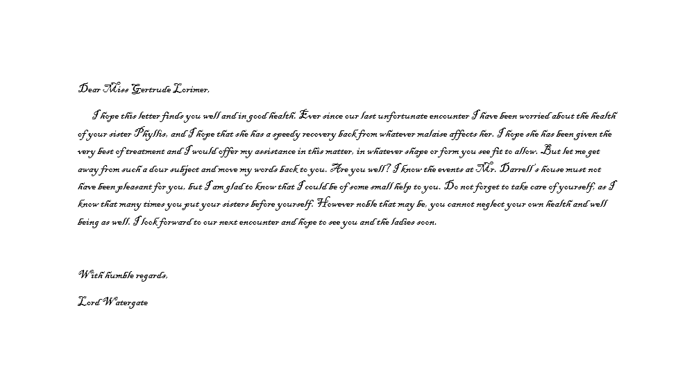 Why is it that I am both eager and afraid to read this letter? Is it cowardice to have such excitement when I see the flourish of Watergates seal on the envelope? I have always thought of women who fawn over men and their words as foolish and conceited, yet here I am, blushing at the thoughtful words of this man. I have honestly spent too much time thinking over the possibilities with Watergate, when I should be focusing that energy on my sisters and our shop. I don’t have time to fret over something so frivolous as love, yet why do I keep pondering over it? There is nothing to be gained by allowing myself to be weak. Only the determined and free woman can truly make something of herself from the ground up, and I don’t need Lord Watergate there to hold my hand through it. Maybe years from now when I have built our business into something too big to fail might I allow something like a romantic tryst. But until then, I need to keep my eye on the prize and not let anything dissuade me from my purpose. There is nothing more important than what I might achieve here with my business. Is that my pride speaking, perhaps, but a little pride in one’s achievements isn’t so wrong in my opinion. Not when so many areas of life are so set against you.