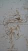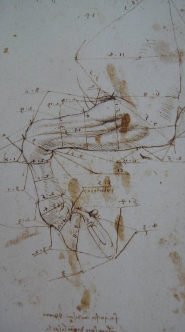 Da Vinci's study of anatomy remains as one of his most astounding science findings. Much of his anatomic studies did not see any application until centuries later; however, his studies of the horse directly influenced the two equestrian statues he designed. Depicted is Da Vinci's sketch of a horse's leg in the air as it walks with lines of dimension measurements on and around it. Using his artistic skills and scientific measurements, Da Vinci helped create structurally stable and realistic equestrian statues. This specific sketch is reflected in Verrocchio's Colleoni equestrian statue monument (Kulenovic and von Platen).