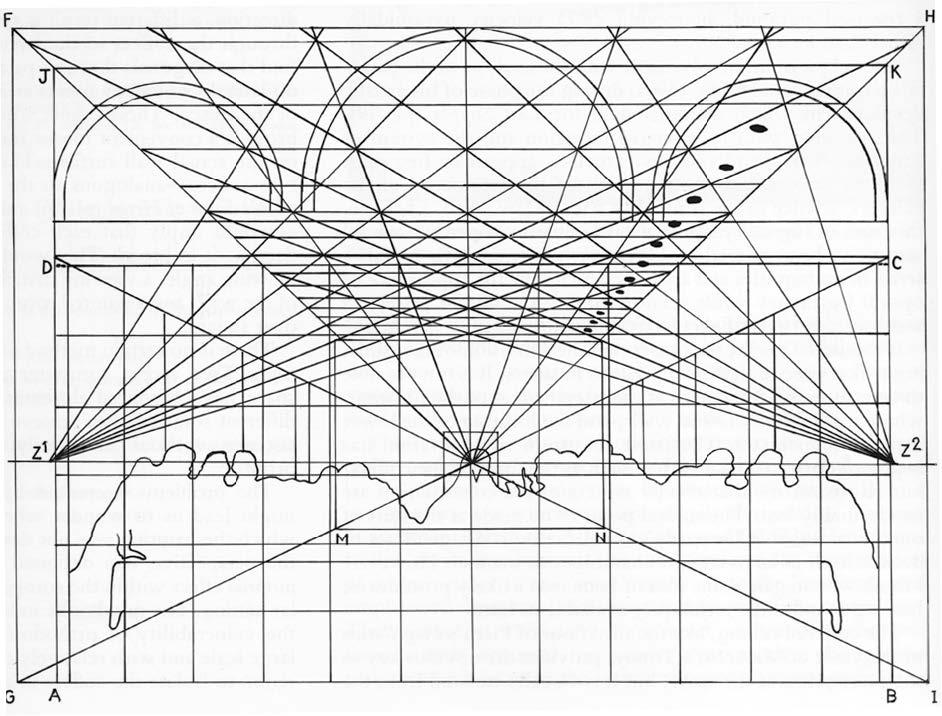 This image shows the perspective lines of The Last Supper by Leonardo da Vinci. Working to popularize the technique of linear perspective first explored by Filippo Brunelleschi, da Vinci used a series of converging lines as a basis to portray the idea of a single vanishing point that concluded at the center of his work, Jesus Christ. This use of depth perception was unique to the Renaissance, varying from the two-dimensional, characteristically-Medieval style that preceded da Vinci. With the knowledge that his painting would be displayed on the chapel wall of the monastery of Santa Maria Delle Grazie, da Vinci aimed to create a similar viewing experience within his audience, regardless of their position in the room (Brooks).