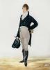 Women’s Fashion was not the only one to make a considerable shift in the Austen’s times, masculine style also underwent a change due to the work of George Bryan “Beau” Brummell. Brummell, portrayed in the above caricature by Robert Dighton, influential figure in the shift of men’s fashion due to hie persona as a self-made “dandy.” Dandy is a term used to describe a man who “studies above everything to dress elegantly and fashionably,” and was coined around 1780 (Nigro and Phillips). In the above picture, Brummel is sporting common clothing for the regency period, ornate white shirt with a chitterlon, or jabot, tucked into a navy waist coat half buttoned up with pantaloons that went into black boots that come to the shin. In one hand he is holding his hat and a cane while the other holds his gloves (Davidson). This signature simplistic and comfortable look associated with men’s wear in the regency period was elevated by Brummell and soon became associated with his “dandy” persona.