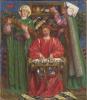 A young woman in red, with the face of Elizabeth Siddal, having her hair combed out by two attendants, is seated in the centre facing to front, playing a clavichord decorated on two panels with scenes of the Annunciation and Nativity; and hung with sprigs of green foliage; holly trees in red barrels stand to the left and right against a wall of bright blue tiles; a black and gold tapestry hangs behind the central figure and falls to form a carpet beneath her feet. (1.55)