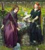 Ruskin, who commissioned this picture, praised it highly (see his letters to Ellen Heaton of November 1855 in Surtees I.35-36). The two women, seated at the fountain in the Earthly Paradise, "symbolise the active and the contemplative life. Leah, the active one, works with tendrils of honeysuckle and carries a red rose in her long loose hair. Both flowers had connotations of sexual attraction for Rossetti. She wears a green dress, the colour of life. Rachel is dressed in purple, the colour Rossetti often associates with inactivity and sometimes even with death" (Grieve 276 ). This dichotomy of "Soul's Beauty" and "Body's Beauty" of course runs throughout all of DGR's work.