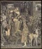 Rossetti's argument using artistic form becomes further elaborated as we notice the other principal aesthetic contradiction in the drawing between the meticulous realism at the level of small details, on one hand, and the symbolic detail that governs the picture at a higher scale of perceptual awareness, on the other. The fawn that “crops the vine” in Rossetti's cunning description brings the differential into sharp focus. The animal locates a moment of ornamental symbolism in the picture, yet its scale and fine draughtsmanship demand more attention than what might be expected for such an accessory. This out-of-scale treatment of the pictorial elements is distinctively Pre-Raphaelite. To realize its significance more clearly, one has only to look at Rossetti's early Poe and Faust drawings, where a more realistic drawing technique defines the separation of nature and supernature (in The Raven: Angel Footfalls, for example).