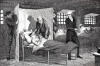 While leaving the saturated prison systems of Britain and having a chance at freedom and land ownership might seem like a light punishment at worst, the treatment of prisoners in the Australian colonies was sadistic, including flogging as this image depicts. Upon arrival, prisoners were sorted into groups based on their skills and dressed in clothes that mimicked a joker's garb with the intent of humiliating the wearers. Unskilled convicts were loaned out to free settlers as servants, while others were forced to perform grueling manual labor under dismal conditions. While these conditions were not much worse than what could have been expected in Britain, it was the lack of humanity in their treatment by superiors that made transportation a sentence to dread. Far from the tangible reaches of Parliament, there was a corrupt sense of power and independence felt by prison authorities, and prisoners would be frequently subject to floggings. Additional punishments were the treadmill where a prisoner was made to walk up a set of revolving steps to power a mill which would grind flour or other spices. The work was tedious and exhausting, but if they misstepped, they risked the mutilation of their legs by the blades below them. The punishments for women were less violent, often involving shaving the head, and in repeat offenders, solitary confinement, which had crippling mental consequences. Bias and prejudice ran rampant among the prison guards with those who volunteered for such jobs often having a sinister motive. All in all, while transportation did result in an improved life for a few convicts once their sentences had been served, for the vast majority, it meant leaving all they had ever known to die a prisoner surrounded by desperation and suffering if they did not perish on an overcrowded convict ship before they even made it to Australian shores as Cruikshank poignantly illustrates in the first image.