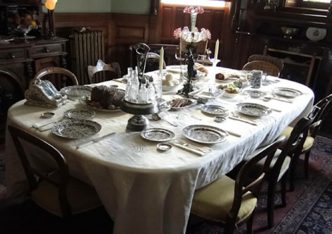 While this is an example of more of a middle class design, I think it's a similar style to the table described in Satis House. Having the places set with fancy silverware and plates, as well as the plates themselves being decorative, is something that a person would see in an upper class house. The chairs in this photo aren't as fancy as the ones in Satis House would be, but having things like a tablecloth and fabric/cushioning on dining chairs aren't things that a person in a lower class family would have.