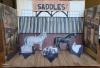 Mock booth for Saddles at The Great Exhibition of 1851, designed by Leo VanderPoel, 2025. This booth mimicks one that might have been found at the Great Exhibition of 1851. The backdrop is a hand-drawing of a stable with two printed drawings of horses attached and a hand-drawn sign above that reads "SADDLES." There are three folded mini saddle racks with images of saddles attached to them glued to the floor of the booth. The sides of the booth are decorated with printed drawings of the Great Exhibition. All of the hand-drawn aspects were initially sketched in pencil and then inked with Micron pens and colored with alcohol markers.