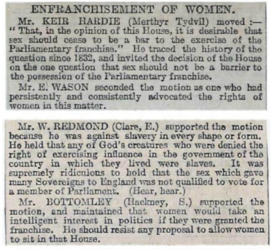 I remember reading this and it brought tears to my eyes. For this was one of the first times that members of the parliament had outright said that they supported the movement that had spread throughout Westminster, London and the rest of England. I remember the day like it was yesterday, reading this clipping from the Times and running through the streets of London and yelling "my suffrage is almost here" over and over again. I remember running into my friend and fellow new woman, Martha's house and showing her the newspaper; she yelled with so much joy that it almost burst my eardrums. But I did not care for this was what I felt was the beginning of the end for the disenfranchisement of women. We were finally going to truly be able to have our voices heard. While I do not usually find pleasure by the comments of men that help to further our push for individualism, because I do not enjoy having to rely on the words of men; these comments by the members of the parliament is something that I enjoy to hear. I hope that these comments only further motivate my fellow New Women and inspire more women to join our movement, so that we push forward with a goal to have the majority of the parliament back our suffrage movement. This pure bliss that the excerpt has brought me reminds me of the reason I fight for my freedom and individualism that I hope to expand upon.