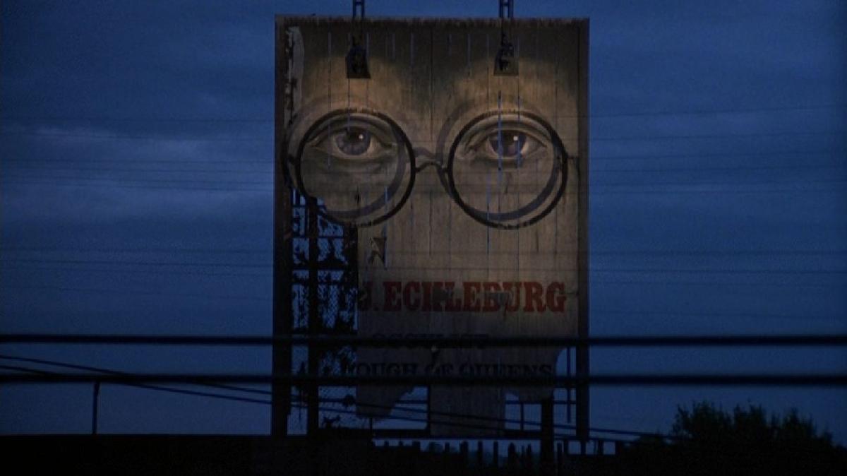 The Eyes of Dr. TJ Eckleburg is a important piece of analysis of The Great Gatsby. The image is creepy and eery. The signage is seen by George Wilson's garage. It is an advertistment for an optometrist. You cannot see the rest of the face, only the eyes. It has weathered over time, because it is filthy. We first see the billboard in Chapter 2 when Nick is meeting George and Myrtle Wilson for the first time. As we know Nick is the narrator of the book so having the imagry of the eyes is a cue to Nick. Saying that he is watching everything.