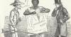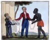 In this image, we get to see a very blatant and obvious display of cruelty to those who are taken for enslavement. The dangling of the child like a prop is such a powerful but useful sentiment for displaying just how much the white people will view blacks as slaves. It helps that the setting is a tradition slave ship, getting across the lack of humanity found in the the transportation and movement of black people across the world. Given the climate and laws that were often used to make black people look less than human, it’s no surprise that the illustration wants to use that as a stepping stone to convey just how disgusting the act of enslavement is to the populace. Exaggerating the ideas as much as possible is necessary in order to make sure that someone looking at the art has a clear understanding of the message, and the black child’s treament sells it more than ever.
