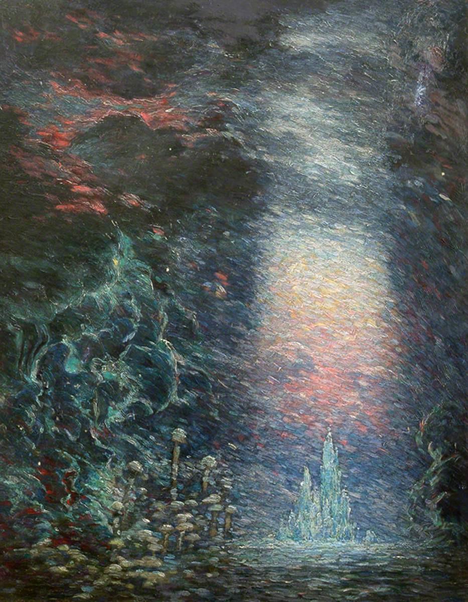 Sidney Sime is mostly known for his works published in periodicals but he also painted landscapes and created fantasy art. This painting, titled “Fountain” and without a date, bridges the line between landscape and fantasy art. The titular fountain sits slightly off-centre as rays of light beam down upon it, appearing almost geological with sharp lines and angles instead of hydrological. Fantasy is “often described by scholars…as a genre that mystifies historical conditions” but opinion has recently shifted towards the genre “representing the unreal and the real, the irrational and the rational” (Credo Reference np). This structure appears to exist outside of the anthropocene timescale, revealing while also concealing a past humanity cannot comprehend.