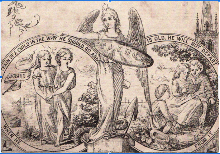 Many propaganda against alcohol revolved around Christianity and oftentimes, alcohol was referred to as “the demon” at this time. In the image we also see a woman, who were often symbolized as a figure of temperance, standing on top of the snake which is meant to portray “the drink”. The woman holding the pledge sign also serves as an incentive to encourage children from a young age to pledge abstinence. This image is also associated with the Band of Hope, the most successful temperance organization which was founded in 1847 and amassed a following of three million members from 1847 to 1926. This organization is still present to this very day under the name of Hope UK.