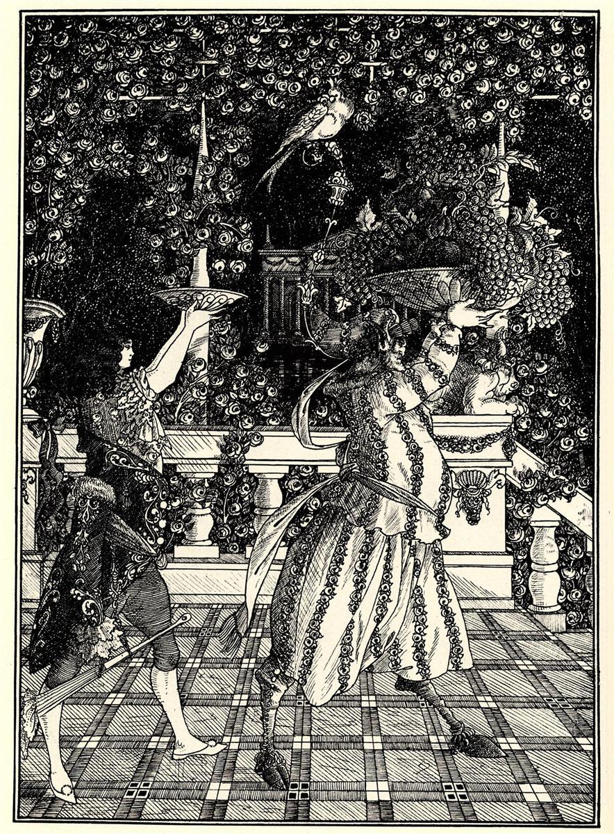 This illustration by Aubrey Beardsley depicts two figures carrying opulent bowls of fruit and flowers. There are several notable elements of this drawing, the first being the male figure, who is drawn to resemble a satyr or faun with his goat-like legs and hooves. Satyrs and fauns, associated with the god Pan, were not only seen in Greek and Roman mythology but were also key pagan figures appearing in the decadent movement. Arthur Machen, an arguably decadent author associated with Beardsley, referred to satyrs and fauns in works like The Hill of Dreams, and most notably used Pan as an inconceivable horror in The Great God Pan. While this Beardsley illustration may not be the most horrific, it certainly is unsettling. The abundance and repetition of circular shapes, along with the mass of blackness in the background, causes much of the top half of the picture to blend together, making it difficult to distinguish the outlines of the lavish bowl of fruit, the woman’s hair, and even where the satyr’s clothes start and end. One effect of this is to draw attention to the satyr’s hooved feet, but it also inverts our expectations of an ’indescribable horror.’ Instead of the irregularity of the satyr’s feet being obscured, it seems that the mundane, ordinary parts of this illustration are hidden, and it can make us question what is more horrific: something merely unusual or unnatural, or things we find familiar that have become shrouded in mystique.