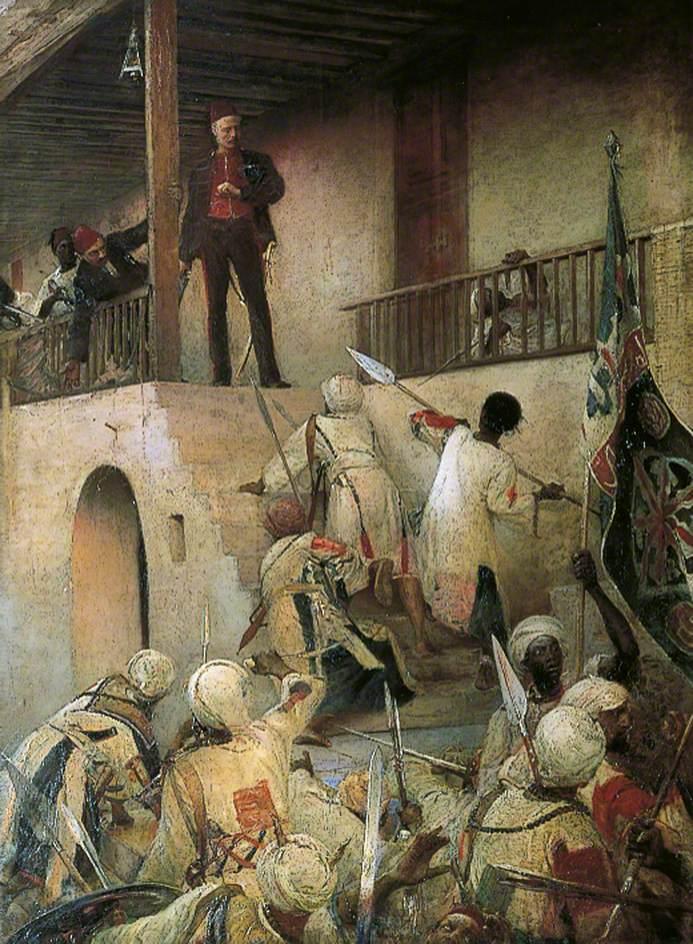 Ahmad, a political leader in Sudan unites many people to seige the town where General Gordon (the man atop the stairs) forces occupy. General Gordon awaits the attack in a heroic manner and is overwhelmed by the Sudanese rebellion in an attempt to gain independence from Britain.