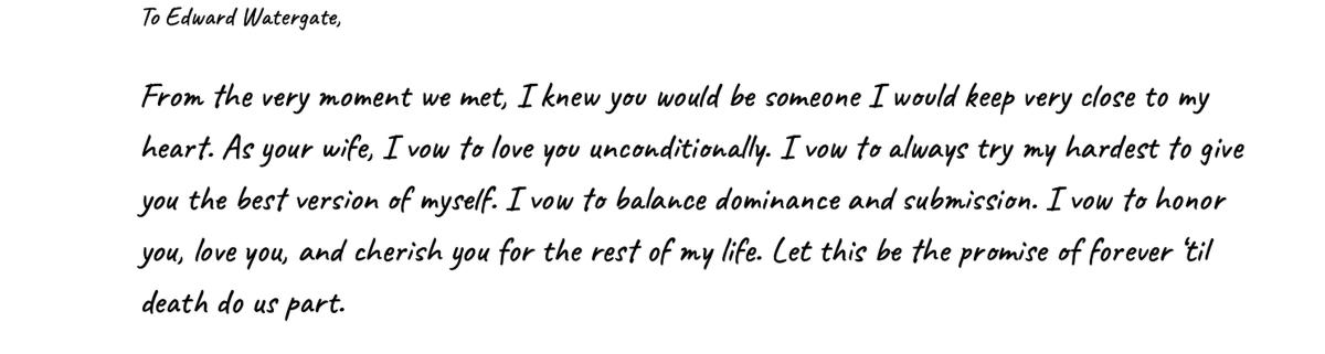 Gertrude’s commentary: Who would have thought a woman like myself would end up with the love of her life? By myself, I mean someone who cherishes their independence and views marriage as the act of surrendering your respect. I certainly would be the last to expect it. You would think that it would be so easy for me to write something like this, especially coming from someone who loves to write — but no. I spent months on end, back to back, thinking of what to say on that very special day. I even sought out Fanny for advice, knowing she had already written hers. I will never tell Edward that, although. I do not think to this day he understands how fortunate I am to end up with someone like him. You see, the thing about me is I am dominant and I demand respect from any and everyone, man or woman. But in times like these, many men fail to treat women as equal, for they only see us as someone who stays in the house and tends to the children. That’s why Edward is different. He is not bothered by my “progressive”, as he would say, mindset or me having a life outside the house. He respects me and that’s why I love him. My view on marriage now is so different, after finding out that people like Edward exist. It makes carrying on the label as a “New Woman”, as they call it, much easier I should say.
