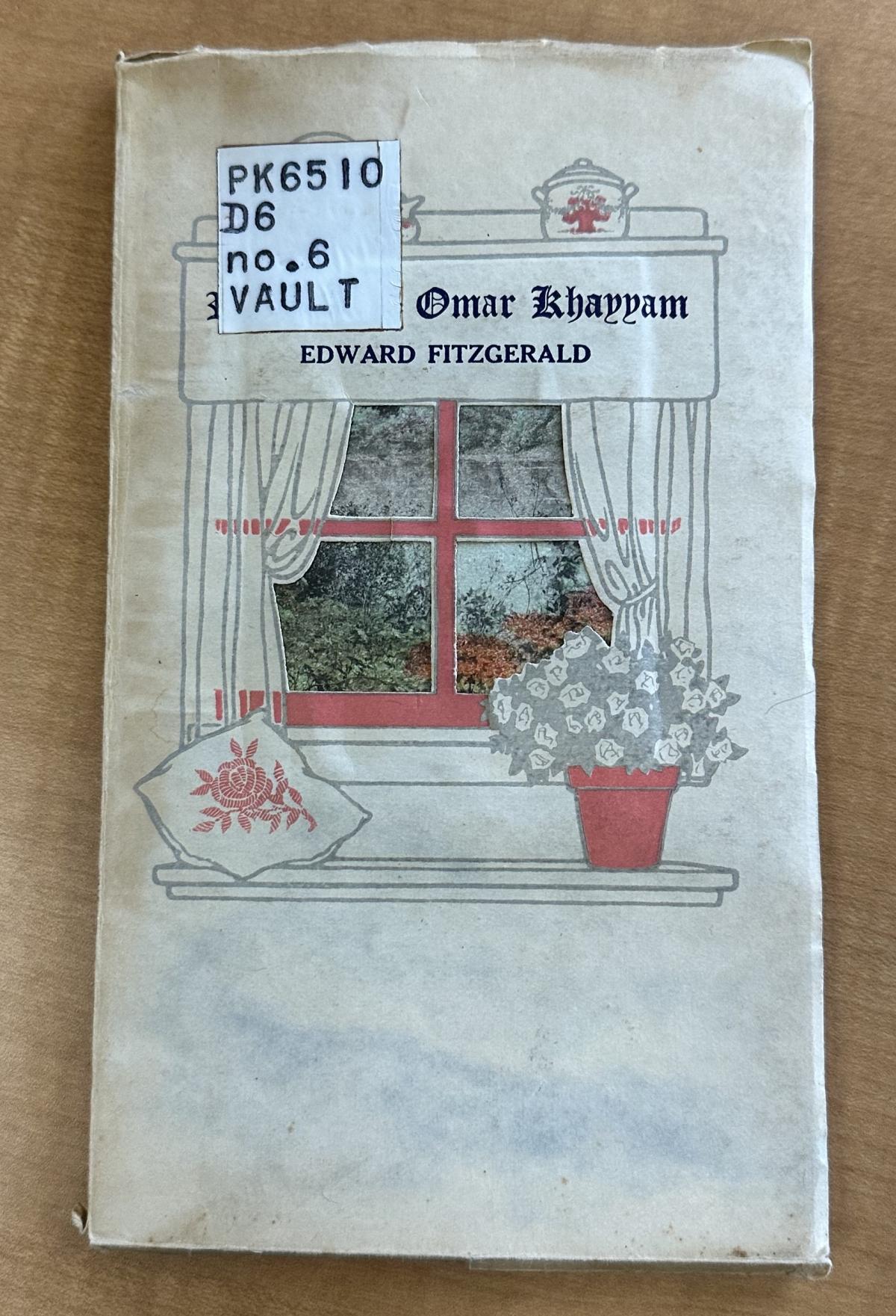 The edition of Fitzgerald’s Rubáiyát published by R.F. Fenno & Company sometime between 1900 and 1920 falls into a strange place in the conversation around gift book editions of the Rubáiyát and Orientalism. Black says when referring to the style and presentation of the gift books, “[The Rubáiyát] value becomes inseparable from its pretty, crafted, possessable diminutiveness. Khayyam’s verse remains entrenched in the categorically Oriental, in the land of seers and Eastern serenity” (61). However, this edition by R.F. Fenno curiously does not drape itself in the aesthetic that one would recognize as characteristically “Oriental”. Instead, the cover (see image 1) features a window looking out into an abstract environment, with cushions and vases decorating the window ledge. Rather than invoking the East, it invokes an almost British sensibility. The interior graphics as well keep this theme, with plates, books, and candles, all presented in a standard Western style (see images 2 & 3). The only graphic element that signals that this is a work from a non-Western perspective is the front matter page. It features a custom-made typography of the “Rubáiyát” in a font that is “Farsi-esque” (image 2). This is the singular visual component that hints at the origins of the work. Black’s argument regarding the nature of the gift book and the Rubáiyát does not seem to apply here as the visual markers that would make the piece possessable or like a jewel do not exist.