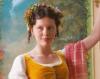 Still of Harriet Smith from Emma (2020), directed by Autumn de Wilde. This image was the primary inspiration for my Harriet Smith silhouette. I was inspired by the colors Harriet is wearing in this scene and used them as the colors for my polka dot background. However, I also think that this scene has greater importance in the context of the relationship of the women. This moment is when Harriet is the most like Emma, which, deep down, is Emma's entire goal. Emma craves Harriet to be like her, and this scene reflects that. She is dressed in fine clothes with hair done very similarly to Emma's. Because this moment is when Emma is the most content with the work she has done in "improving" Harriet, I chose this scene from the movie as a representation of their friendship.