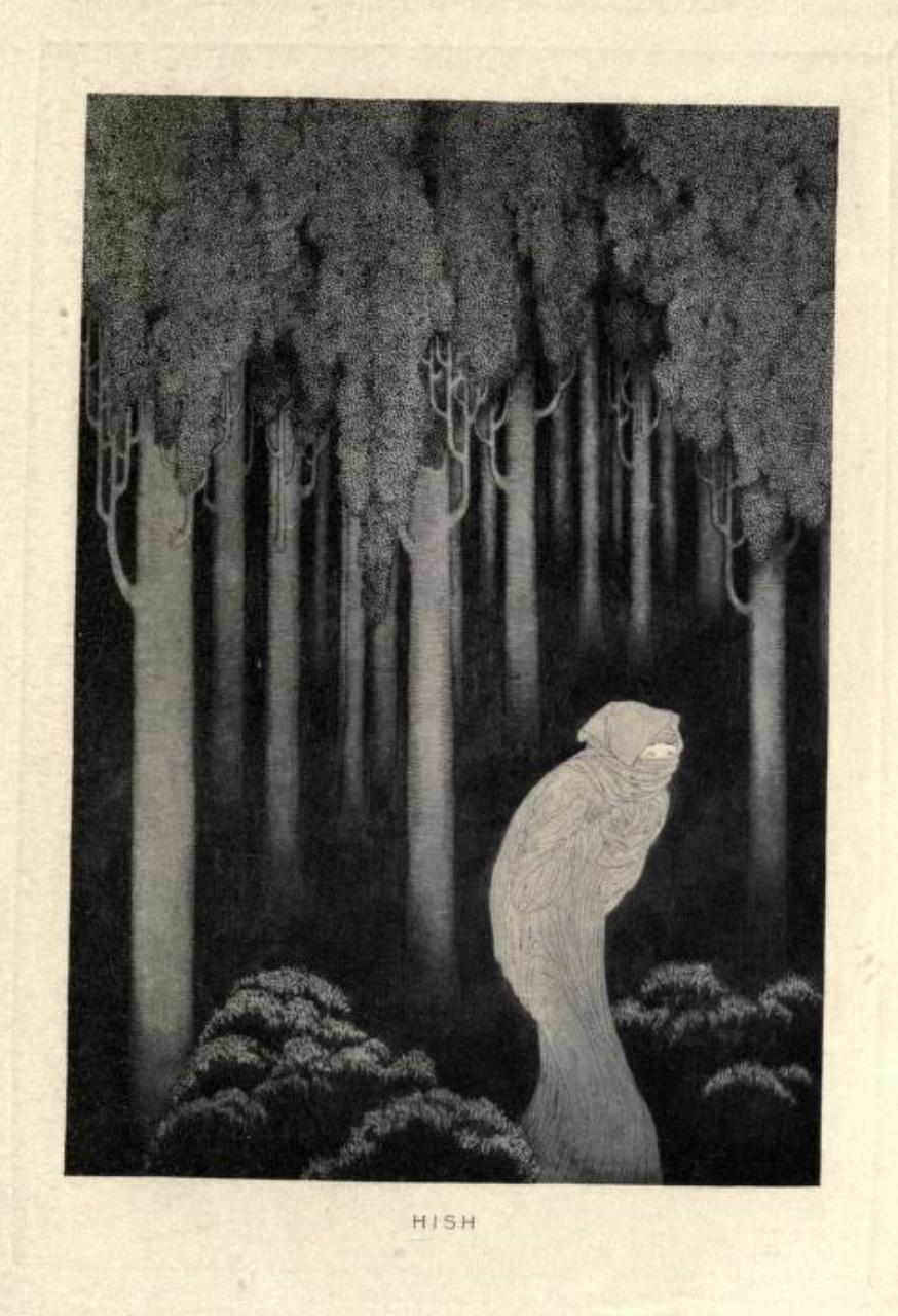 Sidney Sime’s Hish illustrates the Lord of Silence introduced in Lord Dunsany’s The Gods of Pegana. The natural surroundings, the trees and the bushes, in the illustration are where one can see Beardsley’s Japanese style influencing Sime. The figure, Hish, is hunched over in a way that diminishes his presence, and is adorned in layered cloth that covers his mouth and hands. These details add incredible depth to the description given by Lord Dunsany in his book which is as follows: “Hish creepeth from the forest, the Lord of Silence, whose children are the bats, that have broken the command of their father, but in a voice that is ever so low. Hish husheth the mouse and all the whispers in the night: all noises still” (Dunsany 32). Sime’s work first appeared in Dunsany’s The Gods of Pegana, which was originally available for print by commission in 1905, the second edition was printed widely in 1911 (Anderssen 71).