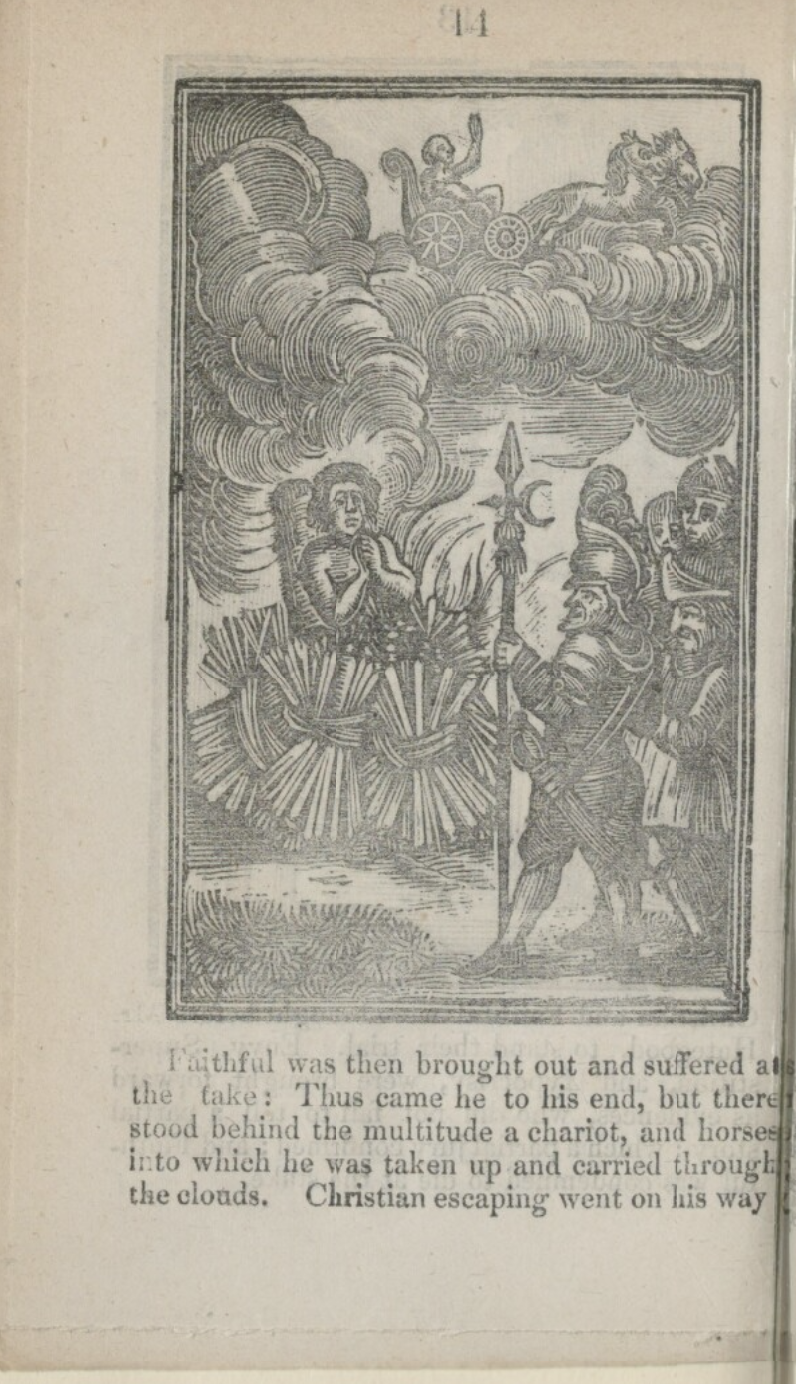 This first plate in the case illustrates the character Faithful as he cries and burns at the stake. Faithful is also shown clasping his hands and praying to God to get into heaven, which he is ultimately sent to. The message to be received from this image is that faith will bring you to the golden gates of heaven, but you have to be willing to die for it. This image demonstrates the violence that was commonly shown to children in the 1600s into the 1900s. As parents believed children to be inherently sinful, violence was commonly used to “scare the sin” out of children. This instance, however, showcases the character of Faithful getting burned for not committing a sin, and, thus, he goes to heaven. The violence in this image is not lost on the children that read it even today. As impressionable as children are, they mus have been in constant fear for their lives after reading this book. Whether or not they committed sin, violence might come upon them. The best way for them to ultimately be sent to heaven was to not question anything and adhere to the Bible.