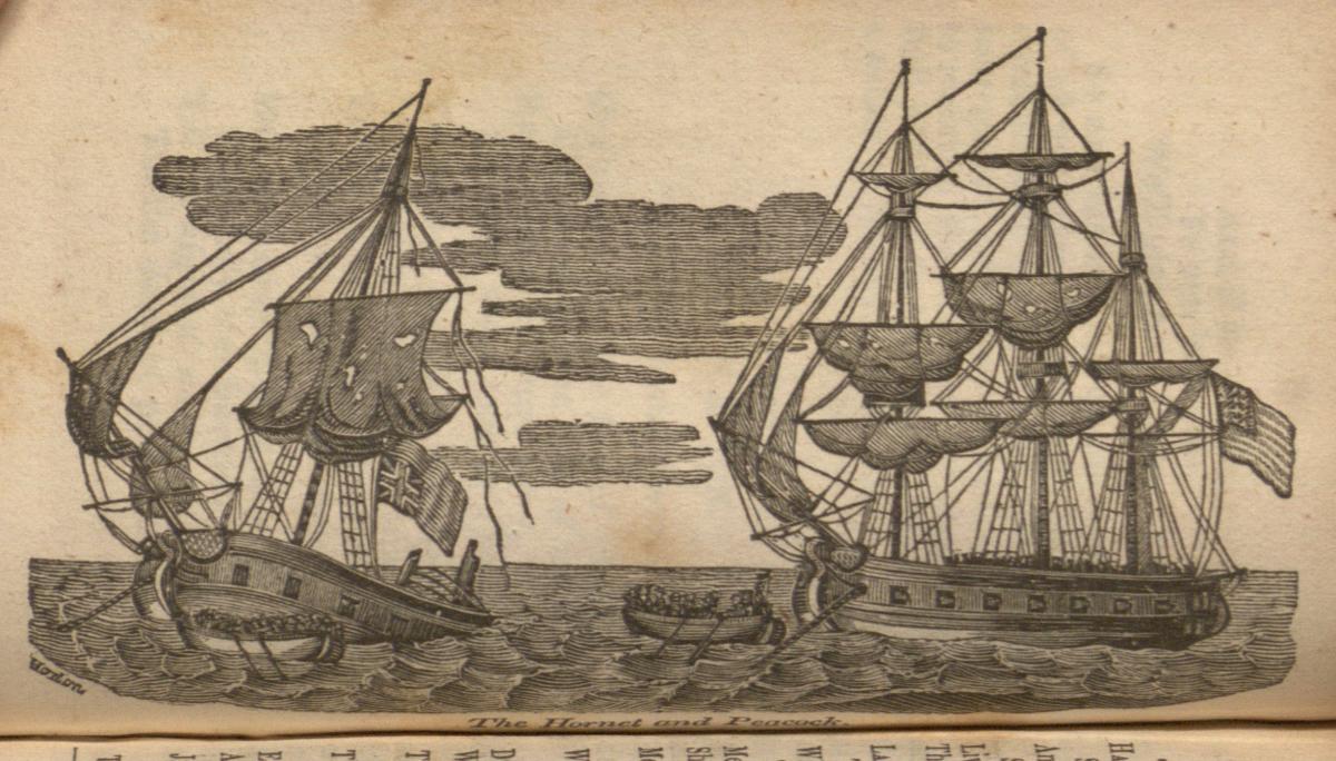 This image depicts a confrontation between an American and a British ship, each displaying their national flag. The flag of the British ship, on the left, is upside down. Both ships have tattered sails. The back of the British ship is sinking into the water, and two of its masts have been reduced to jagged stumps. In contrast, the American ship sits level on the water and retains its three masts; the only evident damage is some holes in its sails. The British are abandoning their ship in two row boats and are pulling towards the American ship.3This image depicts a confrontation between an American and a British ship, each displaying their national flag. The flag of the British ship, on the left, is upside down. Both ships have tattered sails. The back of the British ship is sinking into the water, and two of its masts have been reduced to jagged stumps. In contrast, the American ship sits level on the water and retains its three masts; the only evident damage is some holes in its sails. The British are abandoning their ship in two row boats and are pulling towards the American ship.