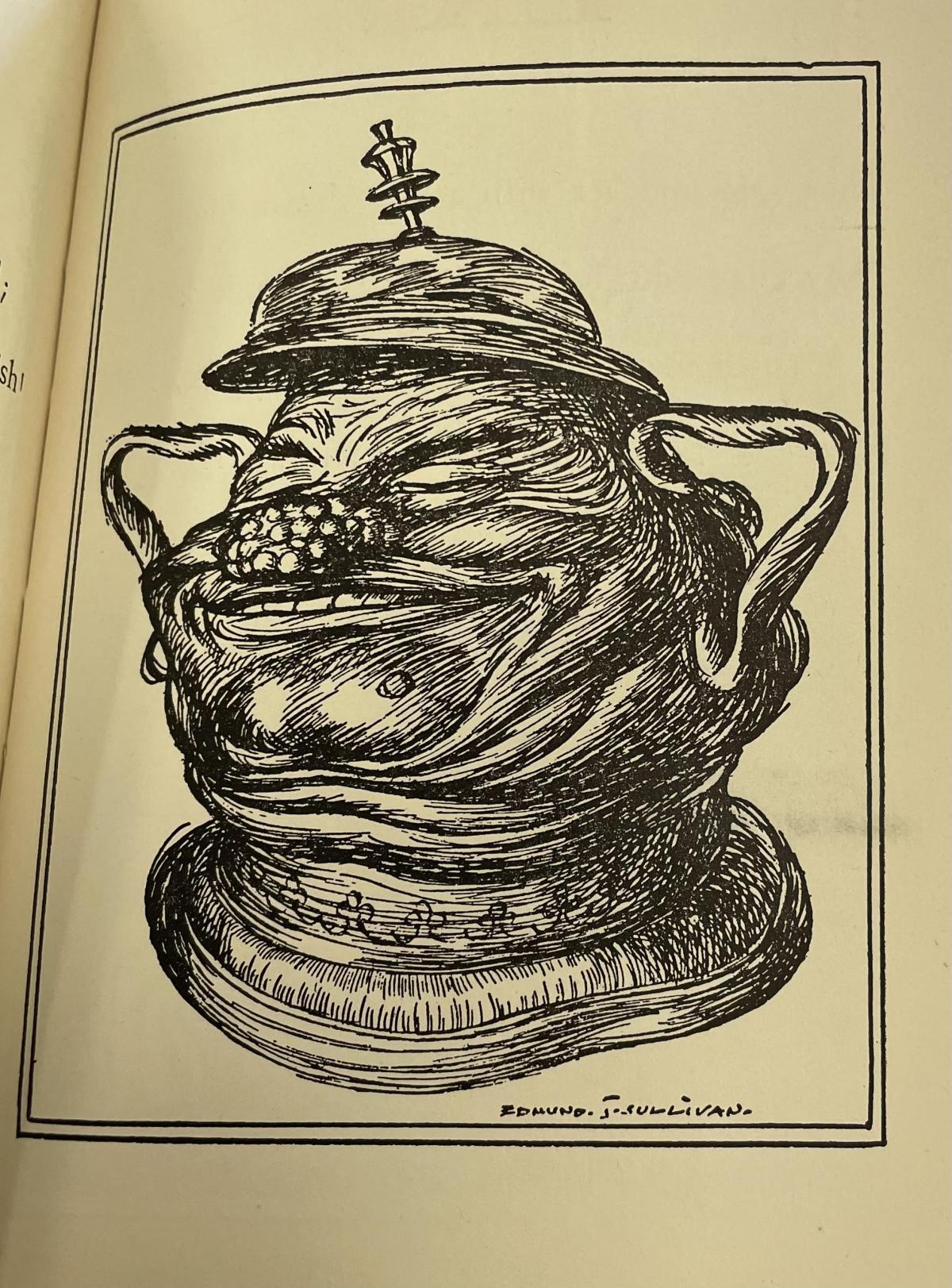 The illustrator of this edition, Edmund J. Sullivan, was a renowned artist and illustrator during the early 20th century. Sullivan's illustrations are highly regarded for their intricate details and emotional depth. His artistic style often blended elements of Art Nouveau and Art Deco, creating a distinct visual aesthetic. The illustration above on page 137, shows the work of a potter, but it is rather grotesque and misshapen. It is referring to a stanza that asks why Potter creates things that are unpleasant to look at. Sullivan's illustrations breathe life into the words of the poem, enriching the reading experience and providing visual interpretations of the themes explored.