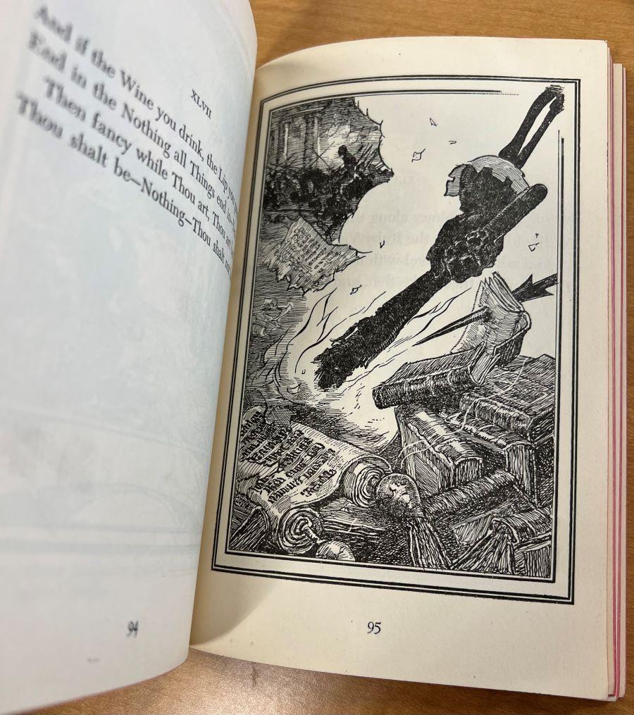 This 1941 edition of the Rubáiyát of Omar Khayyám includes the first and fifth translation of the text. The fifth translation of my edition obviously has less use as the binding is harder to open. There is less wear on the book pages in this section as well, as if they’ve never been read. The publisher had some good intentions with including another version of the text but there’s very little evidence that the past owner looked through it. There are no illustrations from Gordon Ross in this section which may explain the edition’s conditions. Readers often are more attracted to a book that includes pictures to really interact with the text and what’s going on in it. I find this especially when it comes to poetry, as people are more apprehensive to interact when it may be harder to understand or interpret. A more critical fabulation could be assumed of this edition if there was more evidence of interaction but for now, we can only assume the intentions of the illustrators, publishers and editors.