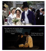 Elizabeth Bennet and Mr. Darcy in the 1995 PBS Version and the 2005 Movie Adaptation of Pride and Prejudice. The fifth image is a collage of the ending scenes in the 1995 PBS version and the 2005 movie adaptation of Pride and Prejudice. These two images work together to successfully illustrate the utter happiness and joy Elizabeth writes about in her letter. The image on top is from the 1995 adaptation and perfectly depicts the line in the letter where Elizabeth compares herself to Jane and writes "she only smiles, I laugh." This image successfully depicts this line, as Elizabeth is pictured laughing in her wedding dress. Even Mr. Darcy, who is famously stoic throughout the novel, is smiling in this image. The image on the bottom is an additional end scene from the 2005 movie adaptation after Elizabeth and Mr. Darcy are married. I have added captions to the image to show what Elizabeth and Mr. Darcy are saying to each other. As seen in the image, Mr. Darcy is "completely and perfectly and incandescently happy," because he calls Elizabeth "Mrs. Darcy." Even though the letter is from Elizabeth's perspective, Mr. Darcy is referenced as he "sends [Mrs. Gardiner] all the love in the world," which does insinuate him being very happy. Therefore, both images highlight not only the happiness of Elizabeth but also Mr. Darcy. Furthermore, in contrast to other Jane Austen novels, the happiness shining through in this letter makes the ending feel not as rushed and the relationship between Elizabeth and Mr. Darcy appear more genuine.