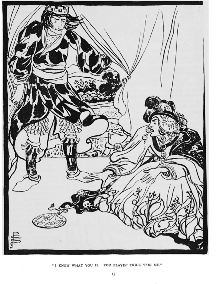 The oral tradition of Annancy stories, passed down by African slaves in living in Jamaica, served as a form of self-expression, retaliation to suppression, yearning for freedom, and cultural preservation even after the 1838 emancipation of all slaves in British colonies. Smith makes this evident in her illustration “I know what you is. You playin’ trick pon’ me.”