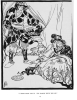 In the foreground, the very distinct depiction of ‘obeah,’ wearing a cloak decorated with what seem to be spiders, octopi, or skulls and bones, can be understood as a statement of cultural pride and also a critique on the colonial practices that outlawed an aspect of Jamaican culture. An emphasis on defying the suppression of culture is evident by this representation of the ‘obeah.’ Additionally, Smith uses illustrative details in clothing to reflect the self-perception of colonized Jamaicans in relation to their colonizers and their judgement of Western values, attitudes, and society. In the headpiece to the tale, and as referred to in the text, Toad is dressed up like a ‘buckra’ gentleman: he wears a long overcoat, fancy shoes, and a lavish plume hat. Upon his demise at the hands of the obeah, his form is changed into that of a regular toad and does not possess any of the luxurious clothing items he formerly had. This transformation highlights the power relations and social status relations between the white colonizer and the native Jamaican. Smith also represents these inequal power dynamics between the ‘colonizer’ and the ‘colonized’ by her strategic situation of the prince and the obeah on the page. The Prince assumes a threatening position above the obeah, who is a Jamaican woman but is dressed up as a white woman or a ‘buckra’ woman, as she looks up at him in fear and trepidation of exposing her true identity. Here, Smith comments again on the disparaged social status of the Jamaican native in relation to the white man, more specifically, the American/British colonizer. Through the analysis of Smith’s illustrations to Annancy Stories, the complex relations resulting from Jamaican colonization become evident.