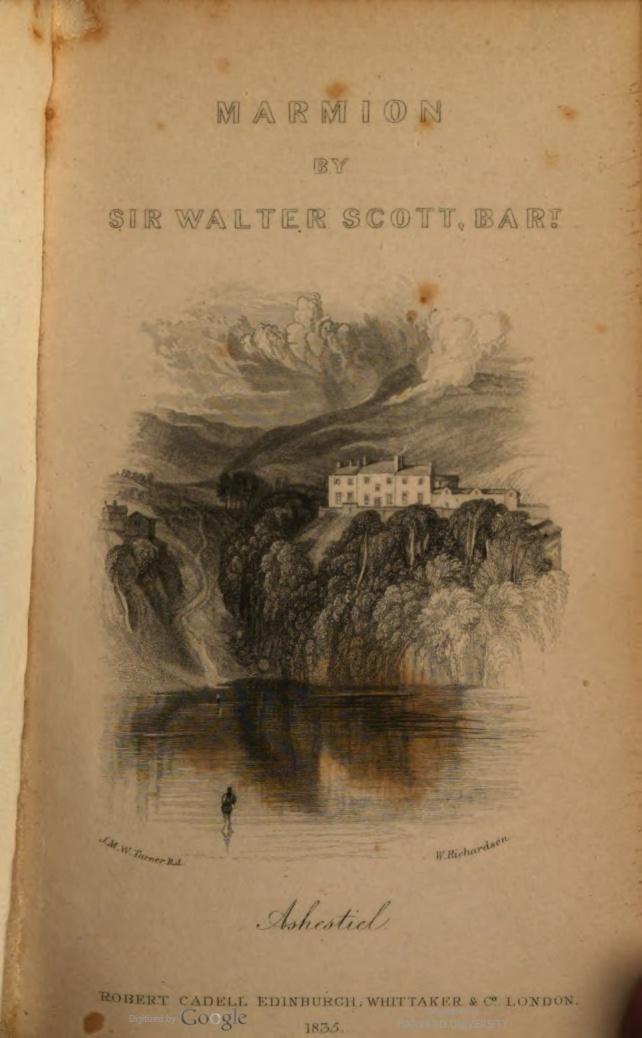 This photo is of a reprinted edition of Walter Scott's poem Marmion, originally published February 22, 1808. This poem is one of many examples of poems and other literature being reprinted and repackaged in a more decorated fashion during the Victorian stage of the Industrial Revolution, as well as being scaled down to be more affordable to lower classes. This became a common practice as technology during this time was advancing, allowing flashier prints, engraving, and illustrations to become more common for publishers to invest in, as it was both easier to manufacture books with these characteristics, and easier to sell these books and recoup the costs. The growing middle-class and the rising literacy rates also contributed to the easier sale of these books and the higher demand for them. Even though these prints were cheaper to manufacture, they were still expensive to buy, and people of modest means would have to carefully select which books they would want to invest in. There were “pocket” editions of some of these stories however, and even though they were more affordable, it was still not an expenditure to be taken lightly. Scott’s publisher decided to capitalize on this in 1825, printing these “pocket” editions to sell more of his popular stories to lower-income readers. Despite the cheaper price, this edition gets added steel engravings, and some editions get illustrations done by Joseph Mallord William Turner, a famous artist with high fees, showing that it was becoming much easier to manufacture books with these characteristics during this time. One of these editions is mentioned in The Tenant of Wildfell Hall, which takes place in 1827, as Gilbert gifts one of these to Helen as a gesture of affection and a way for them to continue bonding over their shared love of literature. Anne Brontë uses descriptions of Gilbert’s workday to illustrate how being a gentleman farmer was a well-paying job at the time, but not to the point of being able to afford luxurious manufactured books without a second thought. Gilbert’s gifting of it, as well as Helen’s reaction, being surprised and attempting to reimburse him, showed how much of an expenditure this would have been, and how this kind of gift was usually reserved for special occasions with loved ones. The Tenant of Wildfell Hall incorporates many elements regarding Victorian Era readers and their reading habits, and this scene is a comment on how the middle-class, which the Brontë sisters grew up in, interacted with the printing and publishing of books at the time. Practices such as printing cheaper and shorter editions of books to sell to lower classes or to put in libraries were used by authors and publishers to make more money and allow more people to engage with their stories, and the Brontës engaged with this in their real lives growing up.