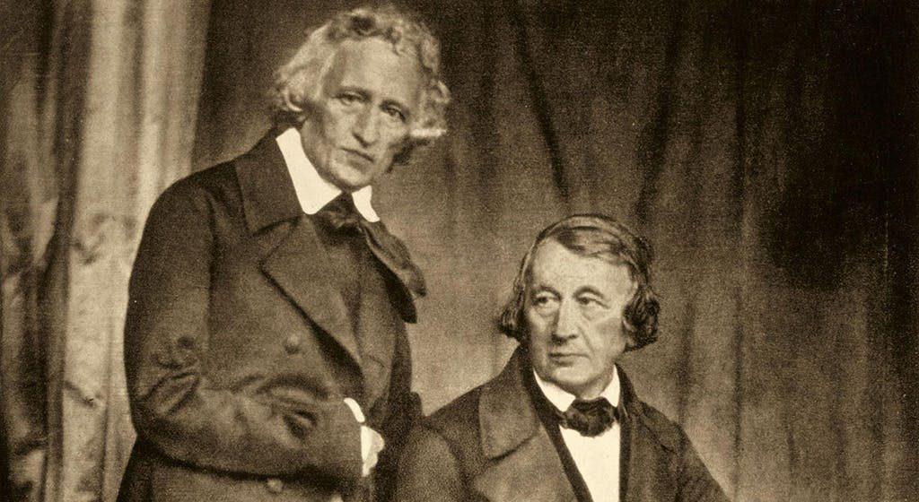 Wilhelm and Jacob Grimm, 1847, daguerreotype by Hermann Biow, Bavarian-studies.org. Jakob and Wilhelm Grimm, the eldest of six siblings, grew up in poverty after their father’s death. Next door to the Grimms in Cassel, Germany lived the Wild family, which included six daughters and a son. The Grimms began collecting folk tales during the French occupation under Napoleon, partly to earn money and partly in defiance. The Wild girls, specifically Dortchen, were key contributors; Dortchen provided nearly a quarter of the tales in their first collection, including "The Frog King," "Hansel and Gretel," "Six Swans," and "Rumpelstiltskin." Wilhelm and Dortchen fell in love, but their poverty delayed marriage until their book gained success. Initially criticized as too scholarly and explicit, the book as Wilhem revised it to appeal to a broader audience, adds phrases like “once upon a time” and “happily ever after.” Their younger brother Ludwig illustrated the first children’s edition in 1825, which became an international bestseller. Thirteen years after meeting, Wilhelm and Dortchen finally married and lived with Jakob happily until their deaths.