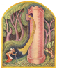 Wanda Gag, “Rapunzel Lets Down Her Hair to the Enchantress," Grimm's Fairy Tales (1823), Jacob and Wilhelm Grimm, 1963 edition, PookPress.co.uk. The Grimm Brothers’ story of "Rapunzel" begins with a couple who long for a child. When the wife craves rampion (rapunzel) from a forbidden garden owned by an enchantress, her husband risks sneaking in to retrieve it. Caught by the enchantress, he agrees to surrender their unborn child to her in exchange for the rampion. The enchantress names the girl Rapunzel and raises her in a secluded tower, only accessible by Rapunzel lowering her long hair out the window. One day, a prince hears her singing and climbs up, and they fall in love. They plan her escape, but the enchantress discovers their meetings, cuts off Rapunzel’s hair, and banishes her to a desert. When the prince tries to reunite with her, he encounters the enchantress, is blinded, and wanders until he eventually finds Rapunzel, whose tears restore his sight. They return to his kingdom and live happily. The story of Rapunzel focuses much more on dramatic elements and emotional engagement than on conveying a strict moral lesson. It involves magical punishment and reward, while captivating readers through suspense, romance, and the hardship the couple endures before their reunion. The conclusion delivers a satisfying, fairy-tale ending rather than a clear moral.