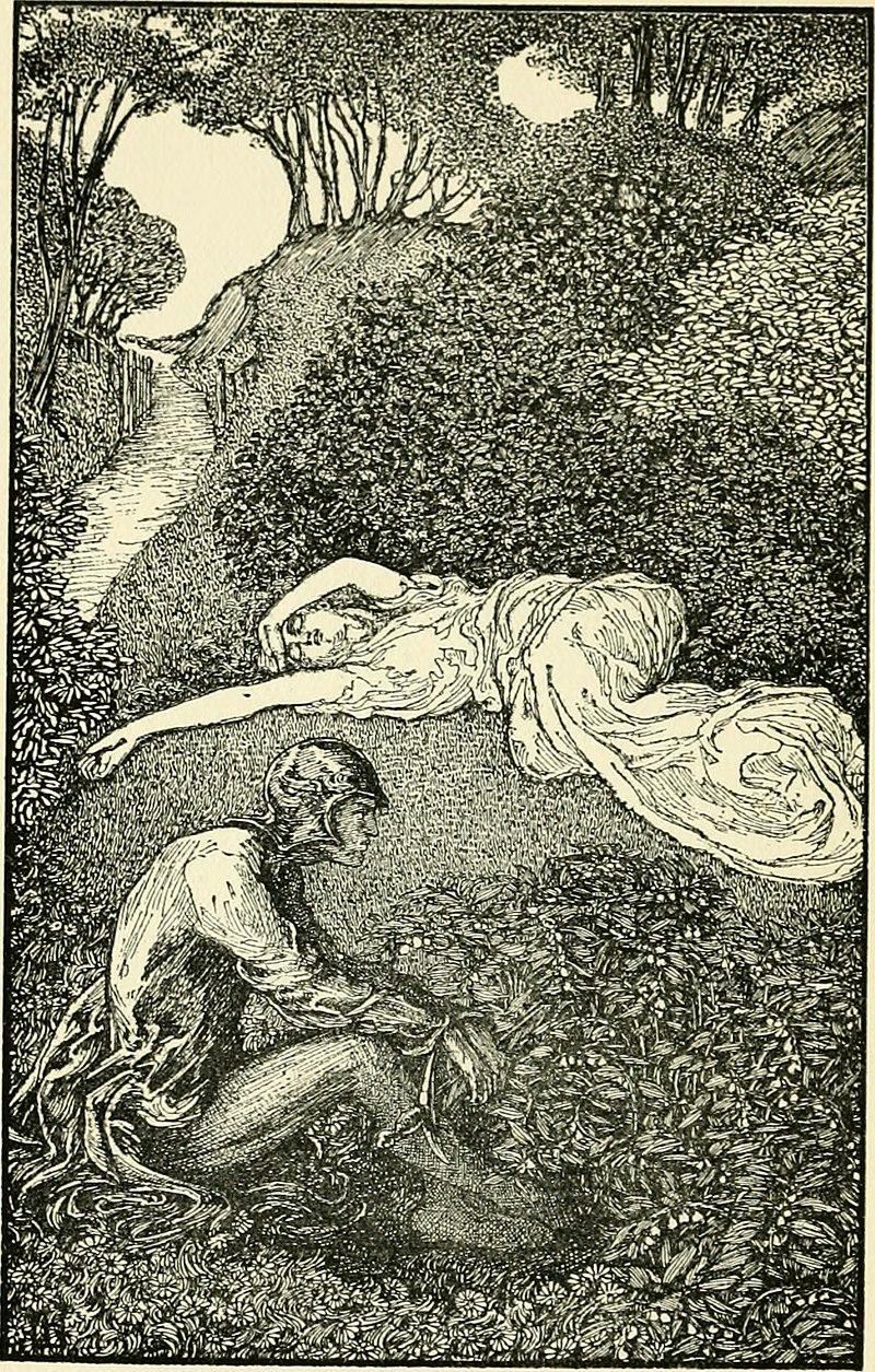 Laurence Housman’s book of fairy-tales, House of Joy, was released in 1895. This illustration, titled “Syringa” and illustrated by Housman himself, accompanies the short story of the same name. It is a framed inset, black and white wood engraving, and is placed at the very beginning of the story on page 86. The illustration depicts the foster brother of the King sitting next to the titular Syringa, who is laying in the garden before her death sentence.