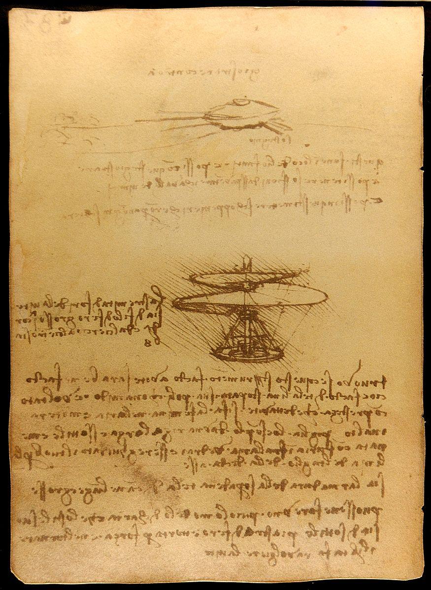 This is an image of Leonardo da Vinci's aerial screw drawing found in Manuscript B, Folio 83v. Because this image is a full picture of da Vinci's notebook page, his notes about the aerial screw are also visable. This drawing was created by da Vinci in the late 1400s, but he never attempted to create a model of his drawing to test its functionality. The design of this device is thought to be based off of the rotation of maple seeds as they fall to the ground and off of Archimedes' screw created in 200 BC. The device is meant to be powered by four men who push the four wooden shafts in a circular motion. Da Vinci believed this would generate enough force to lift the aerial screw in the air. We now know that this design would not be able to achieve flight because the intended materials (reed, linen, and wire) would make the device too heavy. The basic principles of lift used by the aerial screw remain relevent today because they provide the foundation for how modern helicopters fly.