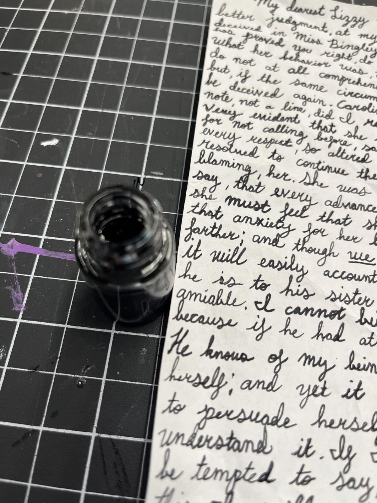 In a letter from Austen's Pride and Prejudice, Jane writes to her sister Elizabeth Bennet about the sudden coldness she is experiencing from the Bingley family, particularly from Caroline Bingley, the sister of the man she is in love with. She describes to Elizabeth how she did not see or hear from Caroline for a long time after calling upon (visiting) her after arriving in London. She then finally returns the visit and is cold to Jane, showing no signs of happiness during the interaction and not expressing a desire to see Jane again. Jane then reasons that Caroline is avoiding her out of an unnecessary protection for her brother, and feels pity for her while at the same time experiencing confusion and sadness. This letter was recreated with ink and a glass dip pen on a regular sheet of white office paper that had been crinkled to give the letter a weathered appearance, as if it belonged to that time period.