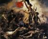 The painting Liberty Leading the People was painted by Eugene Delacroix in 1830. It portrays a characterization of Lady Liberty. She is standing in the center of the canvas on top of a mountain of rubble, and what appear to be bodies. She is hoisting the French flag into the air, gesturing to go forth in the battle. Her dress is torn exposing her bare breast. She is surrounded by men. Some carry weapons, others are wounded or dead. In the bottom left hand corner the eye is drawn towards a dead man laying on the ground. He is not wearing pants and is completely exposed.