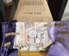 El Marks, "Lighting Fixtures of the Great Exhibition," 2025, cardboard, fabric, ink, collage. This booth displays five lighting fixtures collaged onto an image of the Great Exhibition, framed by fabric meant to mimic curtains. The image is surrounded by names of premier lighting manufacturers at the time, all which had their work shown at the Great Exhibition. The lamps are outlined and colored in for emphasis.