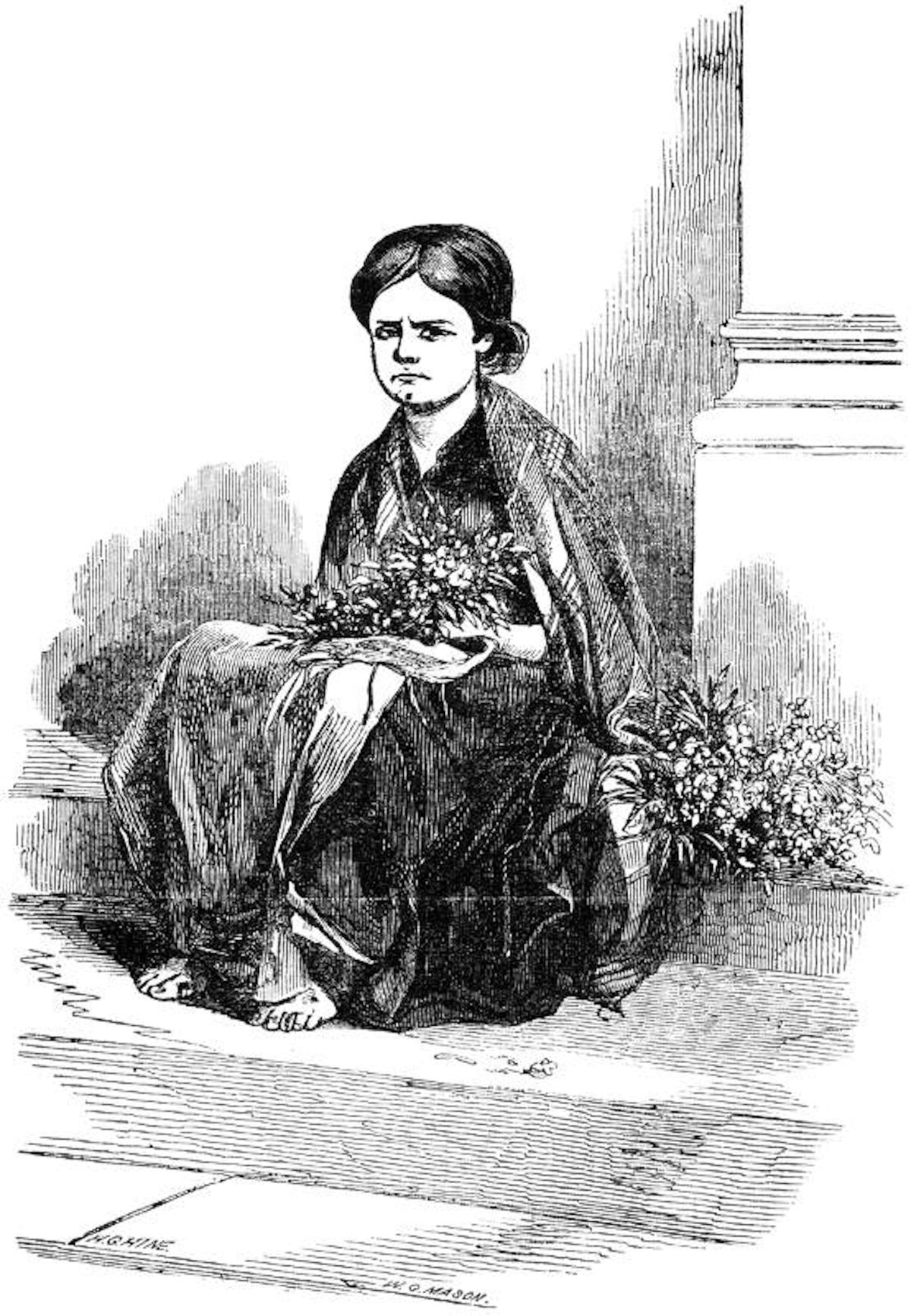 This is of a young girl that is sitting on the side of a building with bunches of flowers in her hand, hoping to sell to those that are walking by here; “‘Do, my dear, go and buy a couple of those wallflowers for my study.’ I don’t do much for working-men; the women’s my best customers.” said by a parson to his wife.