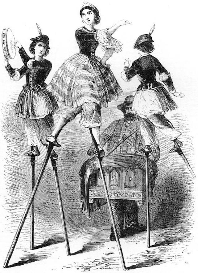 This is a family of street performers, balancing on stilts in the image but also are able to walk on tight ropes. The husband and wife started performing, when they had children, starting them young brought them up in the street performing business. Now they are all together performing, all at different ages.