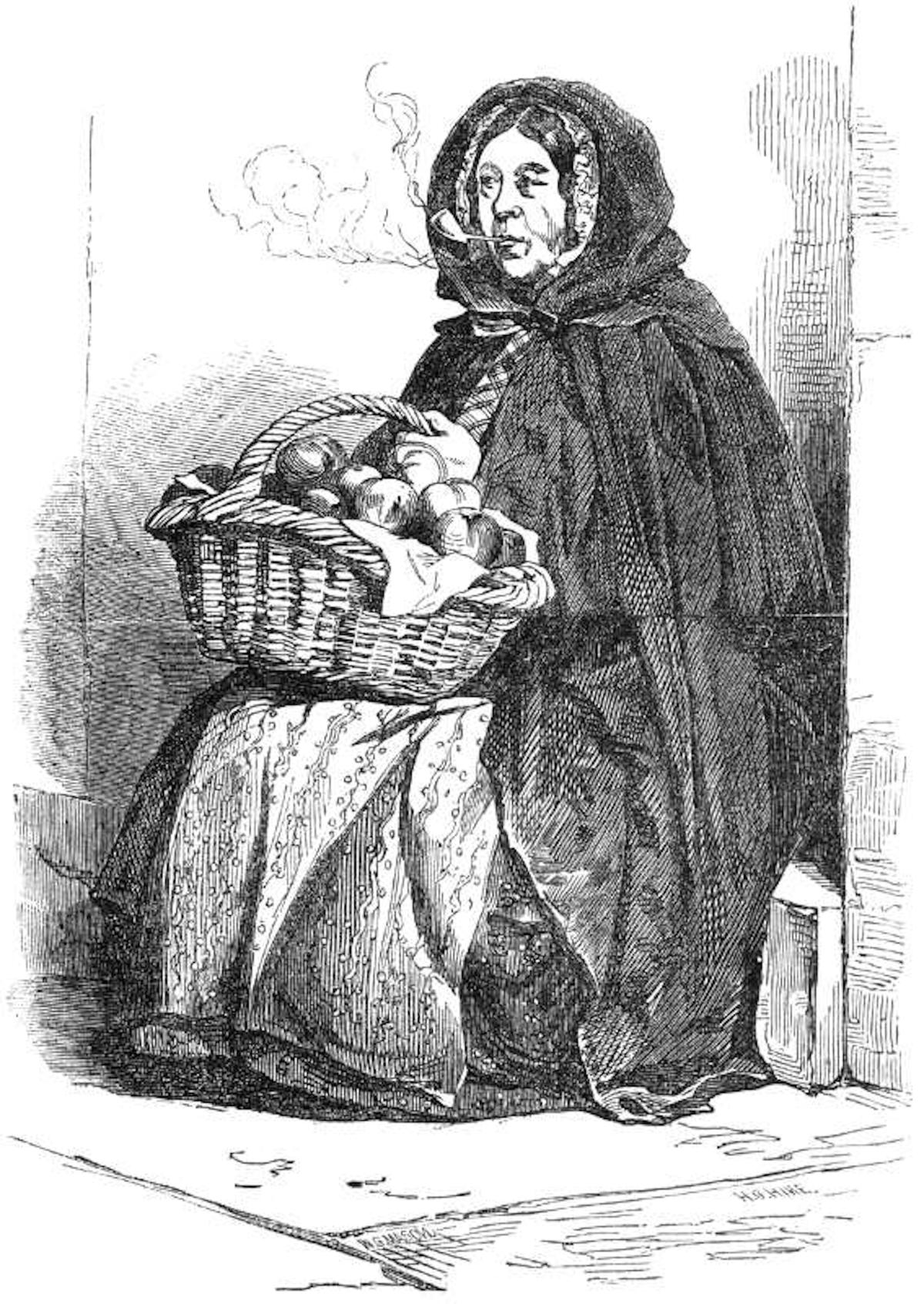 An older irish woman is sitting on the side of the street waiting to sell a basketful of some fruit while she is smoking a pipe; "Sweet Chany! Two a pinny Or-r-ranges– two a pinny!"